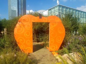 My oldest son, Sam, is 10 and we visited the gardens during his last week of summer vacation, long before Pumpkinville was set up. What surprised me about that visit was how peaceful he found the experience. We had just read a book about intentional urban green spaces together and he came to the conclusion that Myriad Botanical Gardens is one of those. You can read his Kid Review here.
