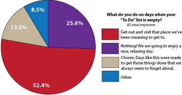 Our October Question of the Month asked our readers to share what they do on days when their “To Do” lists are empty. Over 52%, said that they use the time to get out and enjoy places that they have been meaning to visit. The next highest category, nearly 26%, indicate that they use the unexpected break for a little R&R or to just enjoy a relaxing day. Nearly 14%, says that they use the extra time to catch up on chores and tackle other things they’ve been meaning to take care of, while just over 8% indicated that they do a mix of things with the found time.