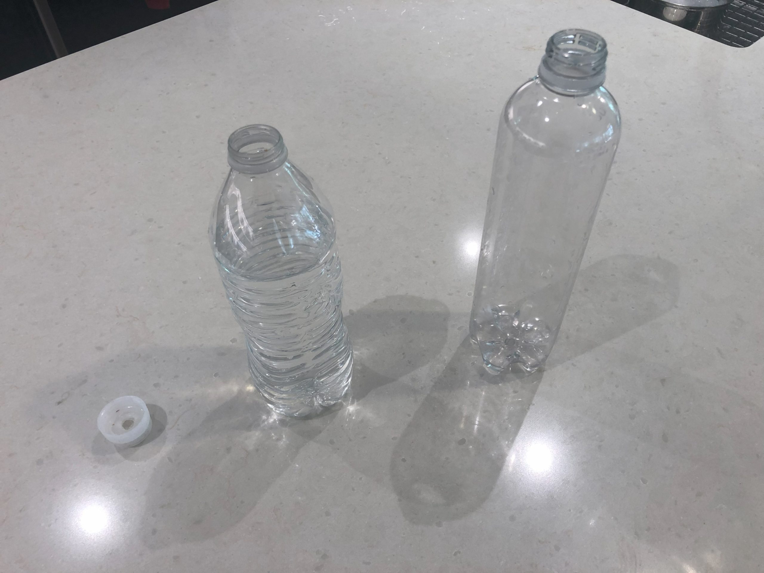 - Take the bottle lids off the containers and put them together so the two tops are facing each other