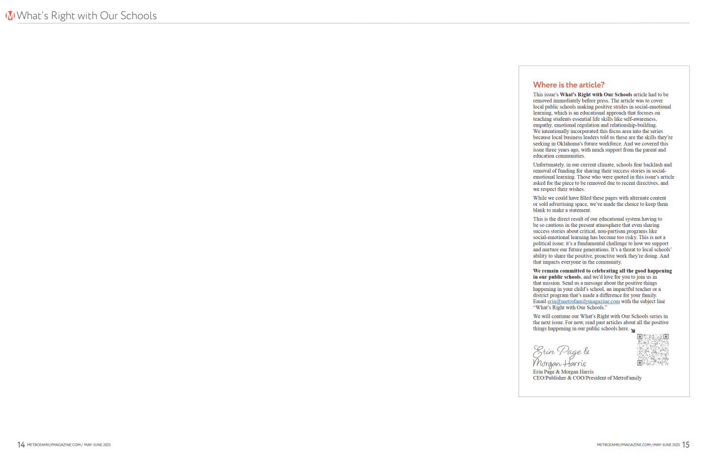 This issue’s What’s Right with Our Schools article had to be removed immediately before press. The article was to cover local public schools making positive strides in social-emotional learning, which is an educational approach that focuses on teaching students essential life skills like self-awareness, empathy, emotional regulation and relationship-building. We intentionally incorporated this focus area into the series because local business leaders told us these are the skills they’re seeking in Oklahoma’s future workforce. And we covered this issue three years ago, with much support from the parent and education communities.