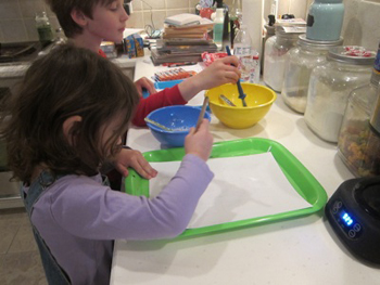 You can make your own stamp glue with things you may already have in the pantry or that can be found easily at the grocery store. I actually had everything on hand, though thanks to a water main break, I had to bust out the bottled water. We followed the simple directions, brushed it on the back of the paper, let it dry, and we had our own stamps! Because this was a spur of the moment thing I just printed some pre-made stamps from DLTK (look for the link at the bottom of the address craft page), but it would be a great assignment to have the kids design their own stamps!