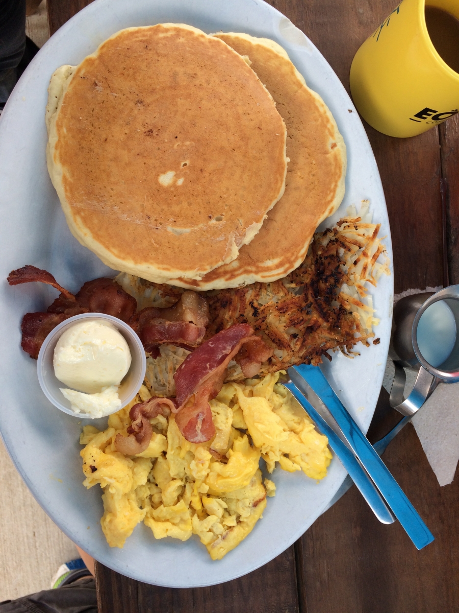 Hangry Man platters ($8.99 each) then ordered a short stack (three pancakes and bacon for $5.99) and a side of bacon ($3) and had plenty of food! The Hangry Man is a lot of food for one person, but it's perfect for splitting. Their a la carte prices are very reasonable and make it easy to ensure you have enough of what you want (bacon). If I wasn’t the only one who would eat them, I would grab the blueberry pancakes, because they look absolutely amazing.