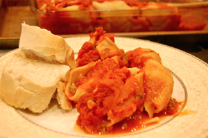 - Now it's time to assemble. Pour some sauce (about 1 1/2 cups) in the bottom of a large baking dish and spread it around. Fill the shells with the meat mixture and line them up in the dish.
