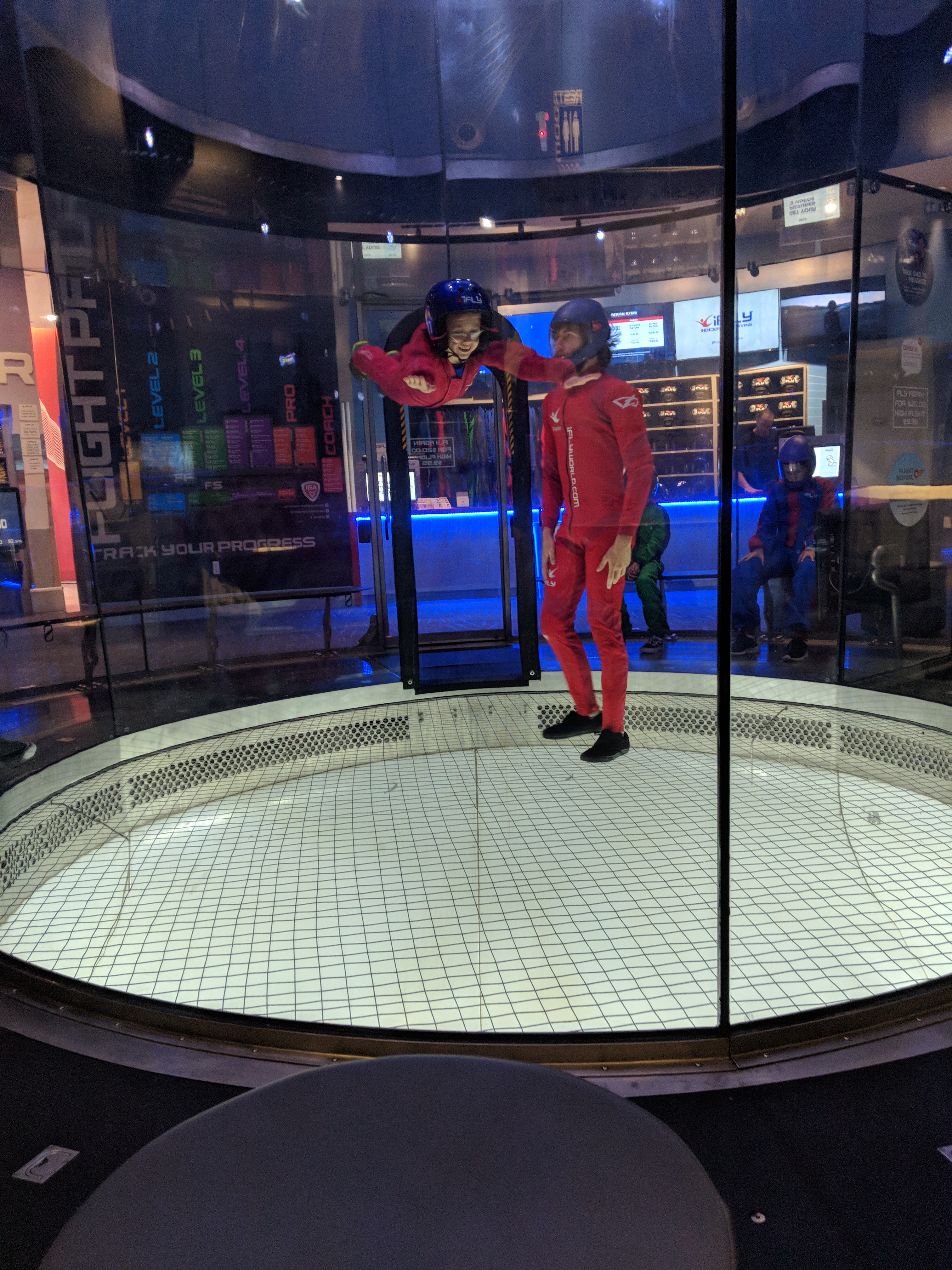 I wasn’t sure any of the above would be applicable to Isaac since he had just enrolled for a couple of classes. His progress, though, from one week to the next was observable. His legs were straighter, he felt more comfortable and capable each time. Class ended with instructors showing the kids some of their skills, which are fun for parents to see too. More than just novelty factor, though, they were a good reminder that the classes are a means to an end. Kids really can build up skills for indoor skydiving, which is a developing sport that also helps with regular skydiving if Isaac did choose to continue either path later.