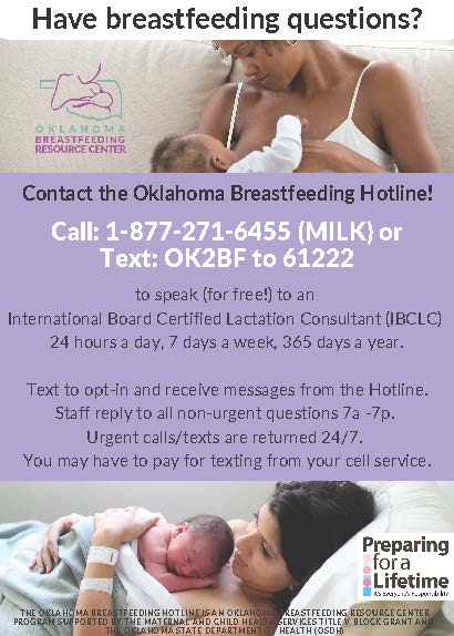 If you are a breastfeeding mom or know one, please pass along these resources. The Oklahoma Breastfeeding Hotline number is: 1-877-271-MILK (6455), or you can reach them by texting: OK2BF to 61222. Further resources can be found through the Coalition of Oklahoma Breastfeeding Advocates, Oklahoma Mothers’ Milk Bank, and Oklahoma Breastfeeding Resource Center (OBRC), which also runs the breastfeeding hotline.