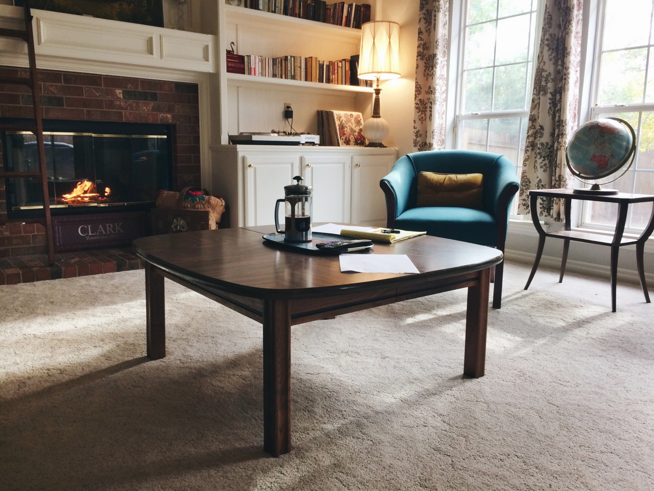 Our precious old kitchen table abandoned in the garage, could it possibly be the one? Could it actually be the coffee table I had been searching the city high and low for? Maybe the reason I hadn’t been able to find anything before was because… I already had it? I ran the idea by my husband one night. Would it even work? Was I crazy to think of it? Can kitchen tables even  become coffee tables?