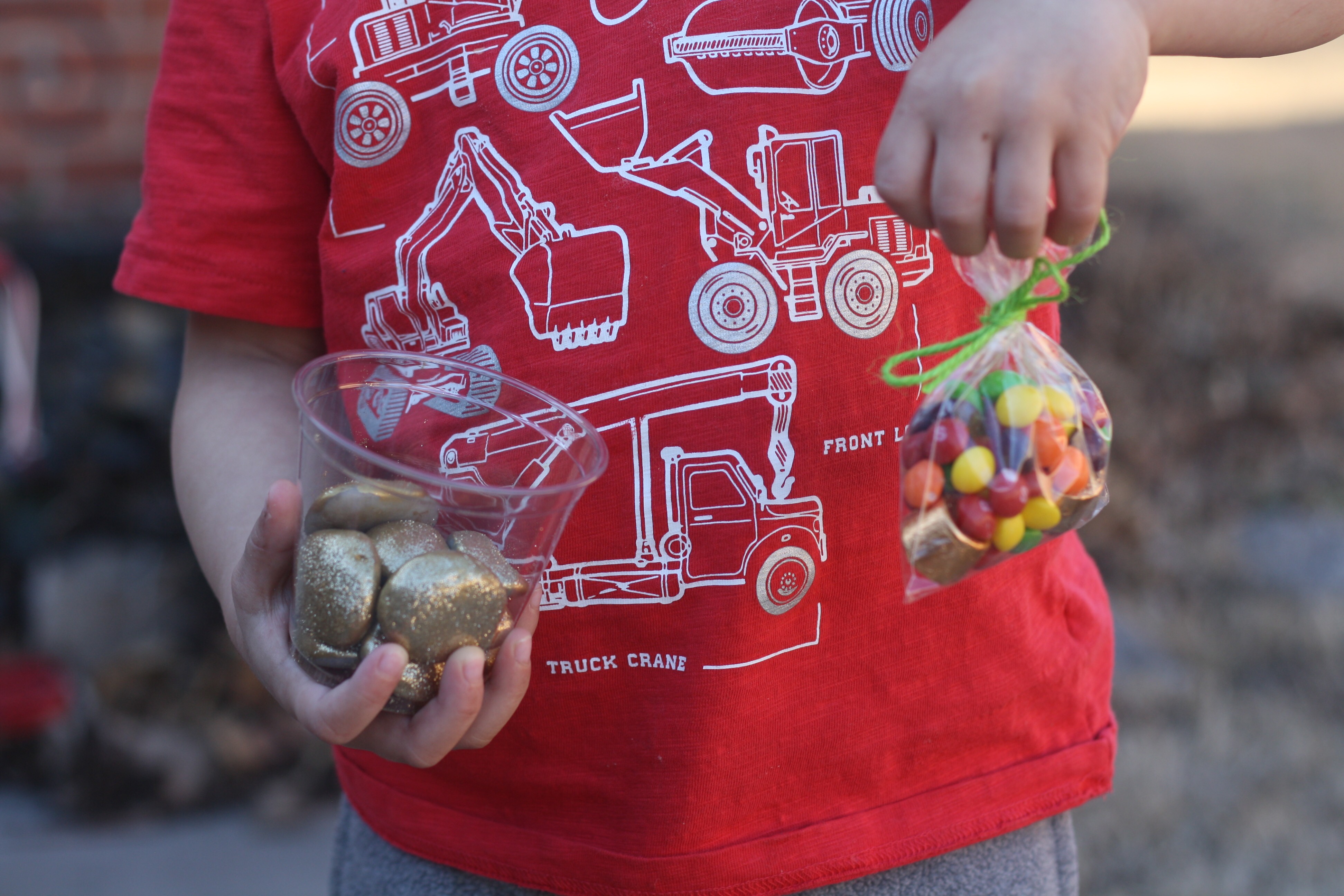 Start by painting your rocks gold. We used acrylic paint, but spray paint would be an easy option as well. We did two coats of paint. While the paint was still wet we sprinkled with the gold glitter. If you want to make sure the glitter doesn’t fall off you could spray with a sealer, since we were going to take our rocks outside we didn’t spray them. While the rocks were drying we packaged up some Skittles and Rolos for our treasure and wrote notes. Then be as sneaky as you can be hiding the rocks to lead to the treasure. My boys really enjoyed being “sneaky” and leaving the treats.
