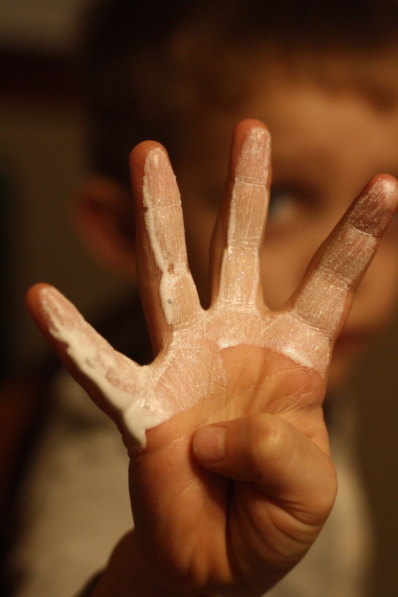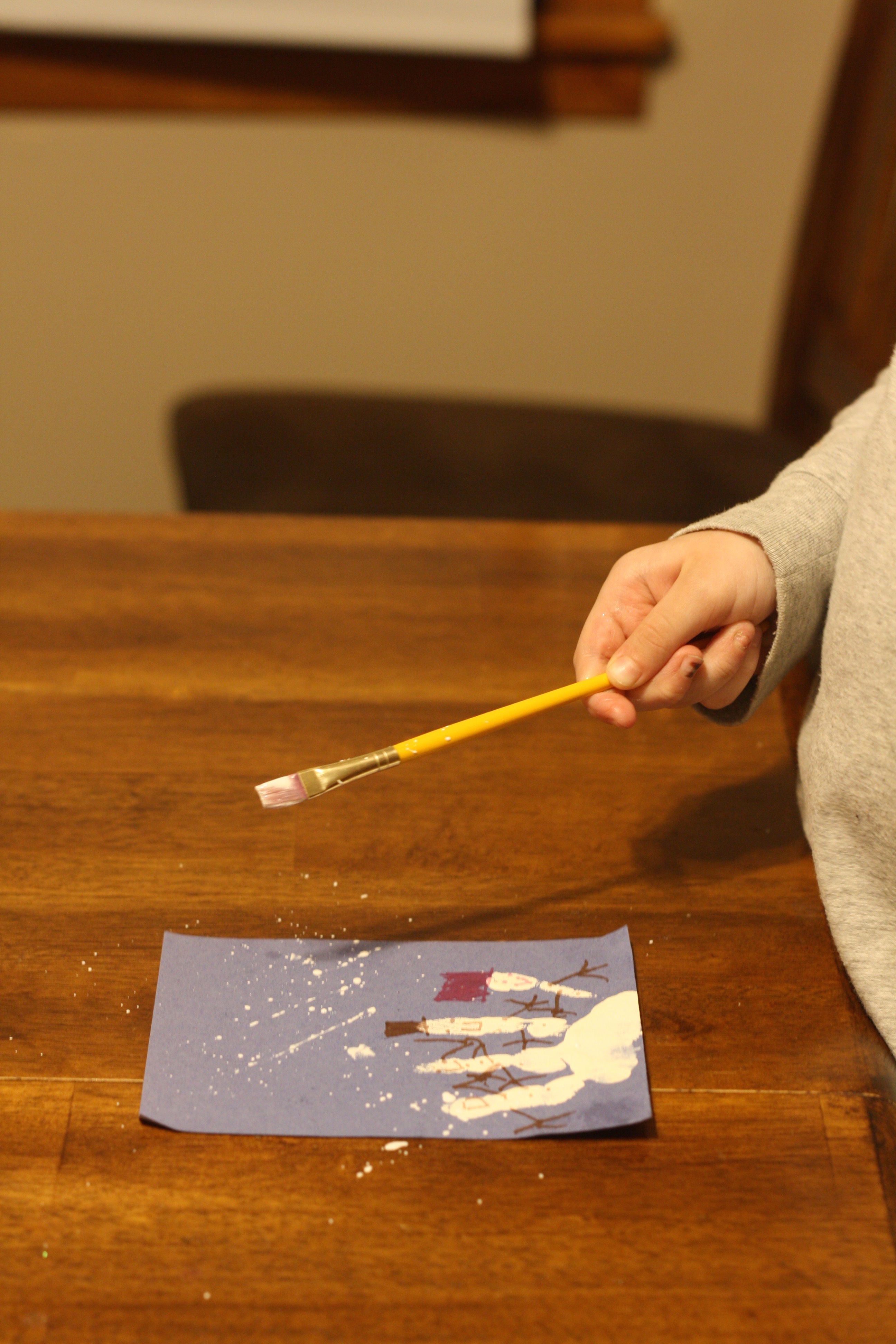 I started out by cutting the construction paper into fourths. If you wish to do a card fold the paper in half or fourths instead of cutting. We choose blue construction paper so that it would look like the sky, but any color will work. I added some fine white glitter to the white paint to give it that sparkly snow look. Paint your child’s four fingers and the top of their palm, then have them make a print at the bottom of the paper. Here is where you can get a little crazy if you're feeling brave…I let my boys splatter more white paint by holding the paintbrush with a little bit of paint and tapping it over the paper. It gives a cool snowing effect, but I warn you it can get messy quickly. After the paint dries add hats, faces, carrot noses, buttons, scarves…whatever you want your snowman and woman to have.