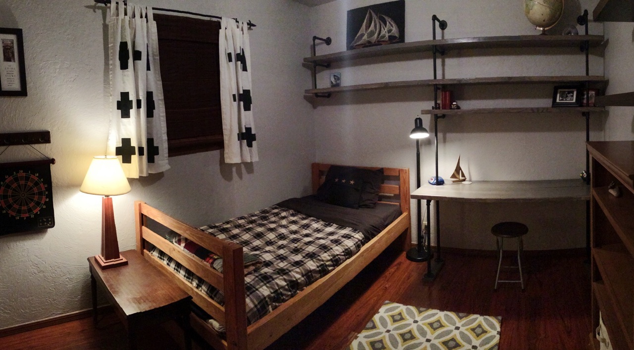 When our oldest boy, Ezra, started entering his tween years, we decided it was time for him to have his own space. We shifted my husband’s office to where the guest room had been and got to work. We were on a very tight budget, so everything had to cost next to nothing, but that’s what makes a project EXCITING in my opinion! Some friends gave us their old twin bed they didn’t need anymore, so all that was left to do was design a desk/shelving unit and add some knick-knacks.