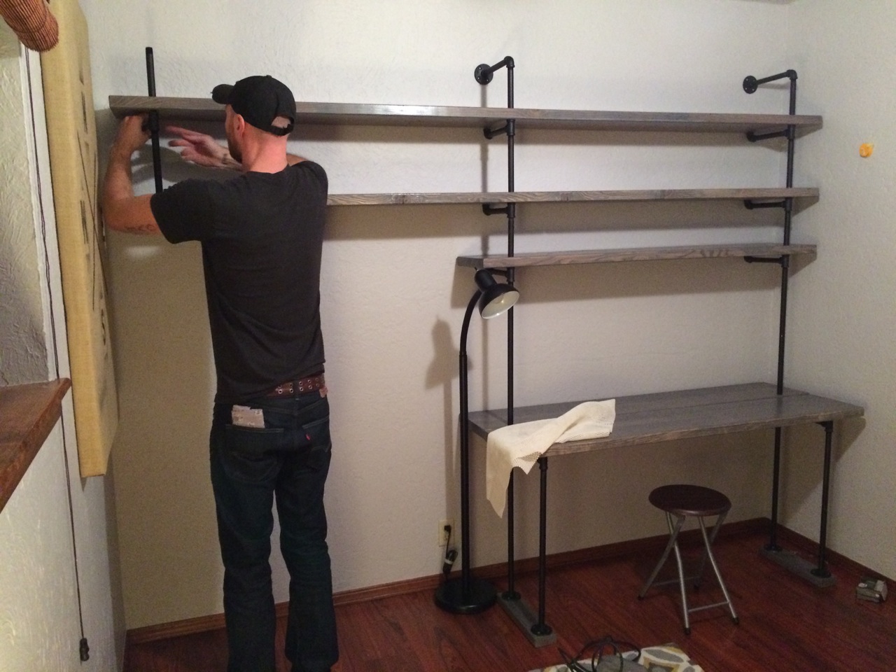 Next, we had to tackle the shelving and desk situation. My handy husband measured the