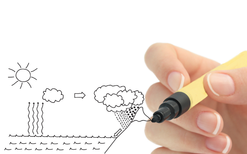 All living things need water to live. 71% of the Earth’s surface is covered in water. 96.5% of the Earth’s water is found in its oceans, but that doesn’t mean it always stays there. Water is constantly moving through the water cycle and changes from liquid, to gas, to solid and back again. These are all different states of water. The heat from the sun causes water on land to turn into gas, evaporate, which can condense into clouds which can precipitate, as rain or snow, which drops back to the earth. The movement of water through its different states and to different locations is called the water cycle. This cycle is important to all living things. Why do you think we need the water cycle?