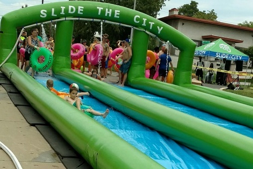 Slide the City came to town, a 1,000-foot slip 'n slide-style attraction. Part of Shartel Avenue closed for the day and it was dedicated to family fun.